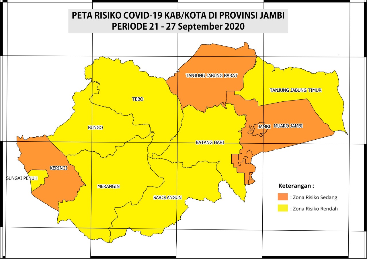 Berikut data pemetaan risiko Kabupaten/Kota di Provinsi Jambi 21-27 September. Kerinci: 2,33 (zona oranye), Bungo: 2,90 (zona kuning), Tebo: 2,95 (zona kuning), Merangin: 3,00 (zona kuning), Sarolangun: 2,92 (zona kuning), Batanghari: 2,92 (zona kuning), Muaro Jambi: 2,35 (zona oranye), Tanjab Barat: 2,37 (zona oranye), Tanjab Timur: 2,80 (zona kuning), Kota Sungai Penuh: 2,58 (zona kuning), Kota Jambi: 2,29 (zona oranye), PROVINSI JAMBI: 2,54 (ZONA KUNING).(mas