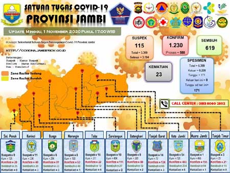 Mediajambi.com – Dalam dua hari ini di Provinsi nihil terkonfirmasi Covid-19. Data dari Satuan Gugus Tugas Covid-19 Provinsi Jambi, Minggu (1/11/2020) jumlah warga Jambi yang terpapar sebanyak 1.230 orang 23 orang diantarnya meninggal dunia.