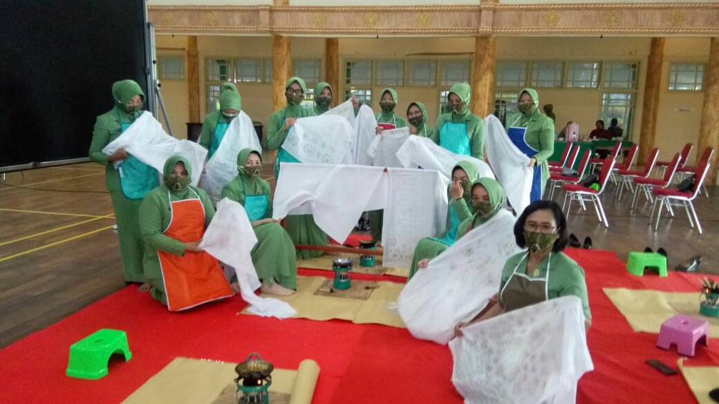Ketua Persit KCK Koorcab Rem 042 PD II/Swj Ny. Dewi M. Zulkifli mengatakan dalam rangka memperingati Hari Batik Nasional yang jatuh pada hari ini, Jumat 2 Oktober 2020, Persit KCK Koorcab Rem 042 mengadakan lomba membatik tingkat Koorcab Rem dan melaksanakan Pelatihan Membatik secara virtual bersama Dharma Pertiwi bagi Pengurus Persit Koorcab Rem, di Balai Prajurit Korem 042/Gapu, Juma’at (2/10/2020).