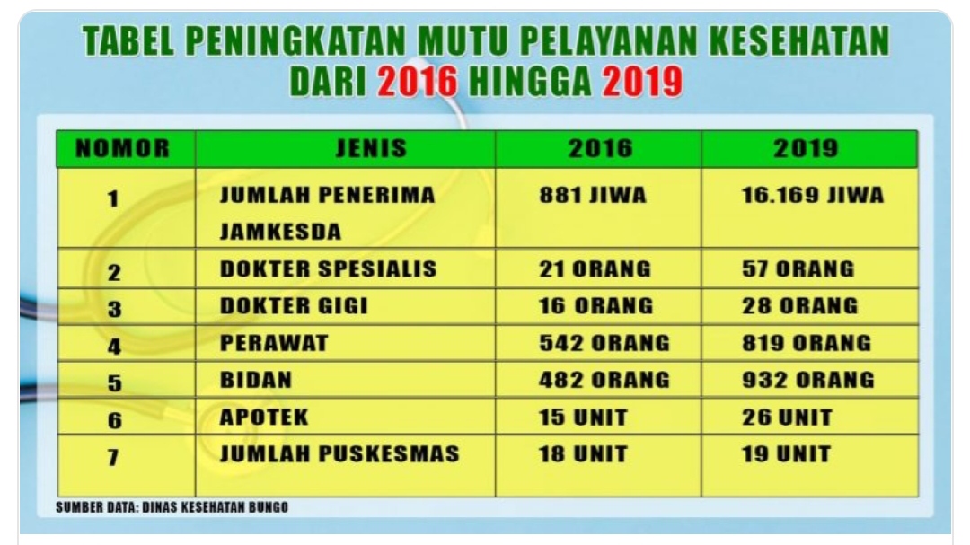 KABUPATEN BUNGO, JAMBI-Keberhasilan H Mashuri dan H Safrudin Dwi Aprianto (Hamas-Apri) selama menjabat sebagai Bupati dan Wakil Bupati Bungo tak hanya di bidang infrastruktur. Keberhasilan pasangan yang mulai menjabat pada tahun 2016 itu juga sangat menonjol di bidang kesehatan.