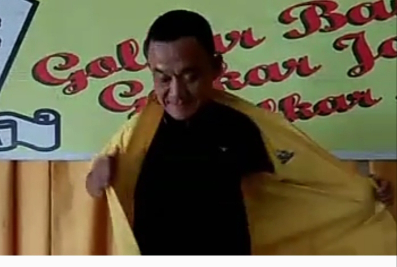 Sebagai tanda keluarnya dari keluarga Golkar, Syarkoni melepaskan baju kebanggaan yang berwarna kuning berlogo pohon beringin tersebut. (lampukuning.id/LK02)