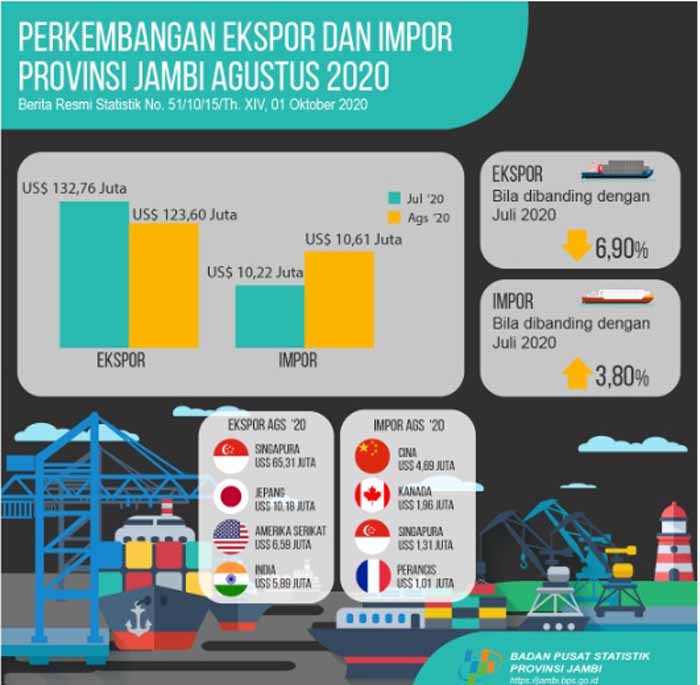 Kepala BPS Provinsi Jambi Wahyudin mengatakan nilai ekspor sampai dengan bulan Agustus 2020 yaitu sebesar US$ 1.144,09 juta, lebih rendah dibandingkan dengan periode yang sama pada tahun 2019, yaitu turun sebesar 44,03 persen. Kontribusi terbesar terhadap total ekspor di Jambi adalah ekspor kelompok Pertambangan yaitu sebesar 48,24 persen, diikuti Kelompok Industri sebesar 43,81persen, dan Kelompok Pertanian sebesar 7,94persen.
