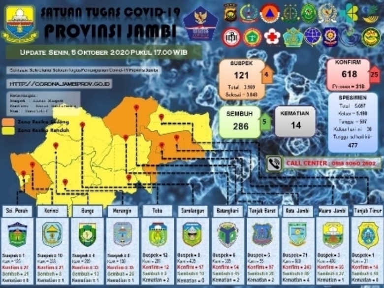Jumlah pasien terkonfirmasi di Provinsi Jambi sebanyak 618 orang, dalam proses isolasi sebanyak 318 orang, sembuh 286 orang, jumlah pasien yang meninggal dunia 14 orang. Spesimen 477 dan suspek 121 orang. (mas)