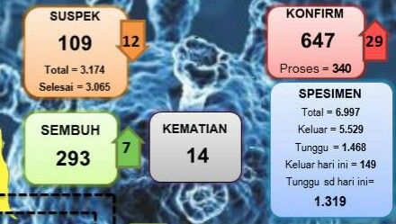 Data dari Gugus Tugas Penanganan Covid-19 Provinsi Jambi, dengan tambahan 29 kasus baru, kini jumlah warga Jambi yang sudah terkonfirmasi positif Covid-19 sebanyak 647 orang. Sementara yang sembuh, hari ini juga betambah 7 orang. Totaknya jadi 293 orang dan meninggal dunia 14 orang.