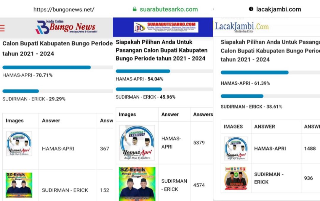Dari penelusuran media ini, di tiga media ini diketahui, di bungonews.id misalnya, Hamas-Apri berhasil unggul telak dari SZ-Erick, dengan perbandingan 70,71 persen Hamas-Apri, 29,29 persen SZ-Erick.