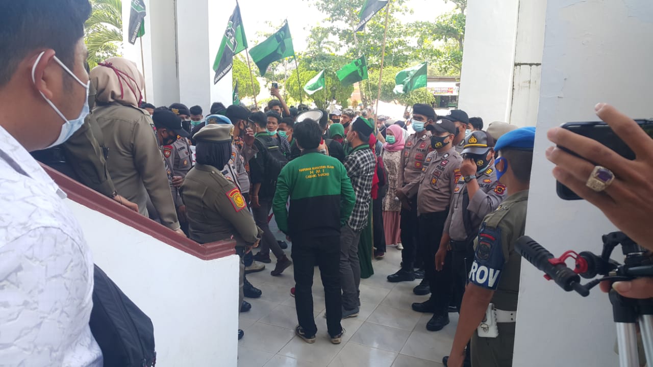 Puluhan Peserta aksi dari HMI yang melakukan aksi protes tentang di sahkannya Undang Undang Onibuslaw yang di anggap tidak berpihak kepada kepentingan masyarakat.