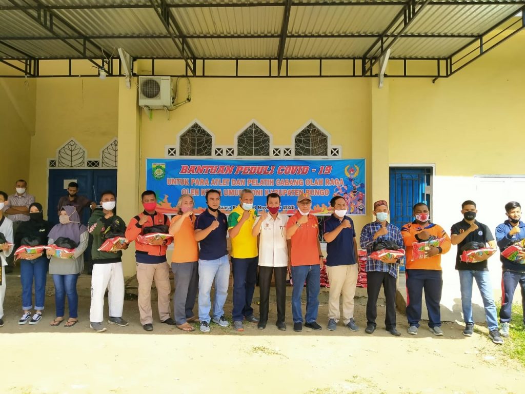 JAMBI– Komite Olahraga Nasional Indonesia (KONI) Kabupaten Bungo, memberikan bantuan kepada para atlet dan juga pelatih. Bantuan diberikan KONI merupakan program peduli Covid-19 , yang diserahkan, Jumat (13/11/2020).