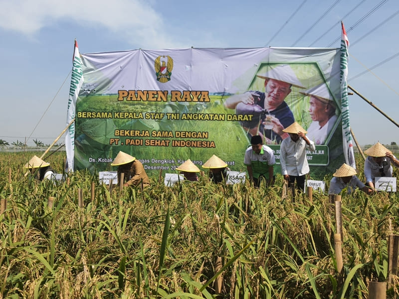 Sebagai langkah dan upaya besar dalam program ketahanan pangan, Kepala Staff Angkatan Darat (Kasad), Jenderal TNI Dudung Abdurrahman hari ini menggelar Syukuran Awal Panen Budidaya Padi Metode SI-28 kelompok tani binaan PT Padi Sehat Indonesia di Dusun Kobak Karim Desa Kalangsurya Kecamatan Rengasdengklok, 12 Desember 2022.