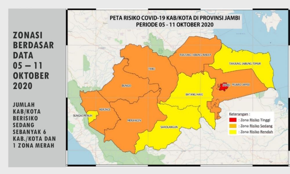 Selain itu Johan juga mengungkapkan, berdasarkan hasil pemetaan yang dilakukan Satuan Tugas (Satgas) Covid-19 Provinsi Jambi periode 5-11 Oktober 2020, Kota Jambi berada pada zona merah risiko penularan Covid-19. Sementara itu, enam kabupaten lainnya berada pada zona orange. Yakni Kerinci, Merangin, Bungo, Tebo, Muarojambi, dan Tanjung Jabung Barat (Tanjabbar).