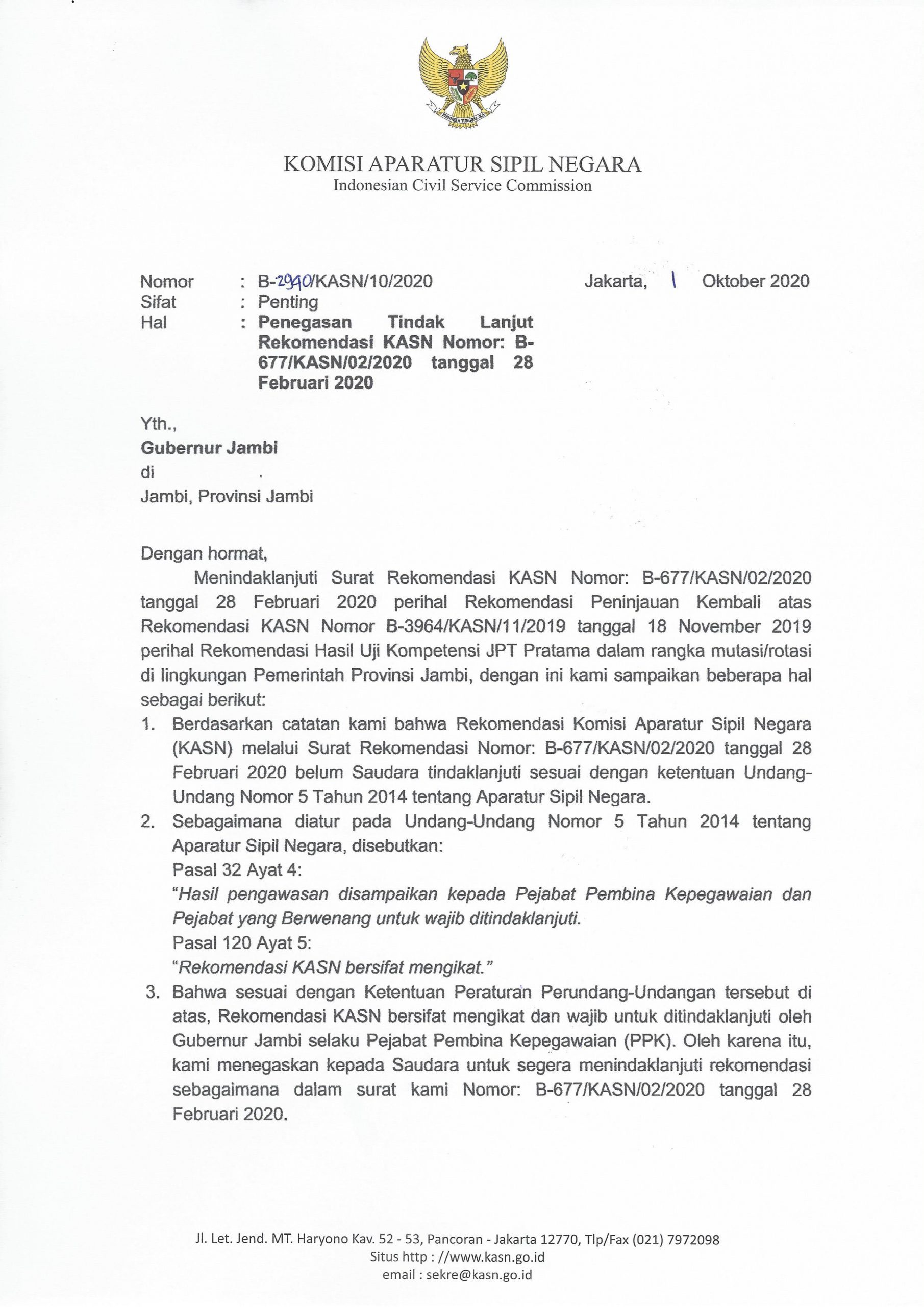 Teguran tersebut tertuang dalam surat Nomor: B-2940/KASN/10/2020, tertanggal 1 Okpotber 2020, bersifat Penting dengan Perihal Penegasan Tindak Lanjut Rekomendasi KASN Nomor: B-677/KASN/02/2020 Tanggal 28 Februari 2020. ‘’Berdasarkan catatan KASN bahwa Rekomendasi Komisi Aparatur Sipil Negara (KASN) melalui Surat Rekomendasi Nomor. B-677/KASN/02/2020 tanggal 28 Februari 2020 belum Saudara tindaklanjuti sesuai dengan ketentuan UndangUndang Nomor 5 Tahun 2014 tentang Aparatur Sipil Negara,’’ begitu bunyi salah satu poin dalan surat KASN tersebut.