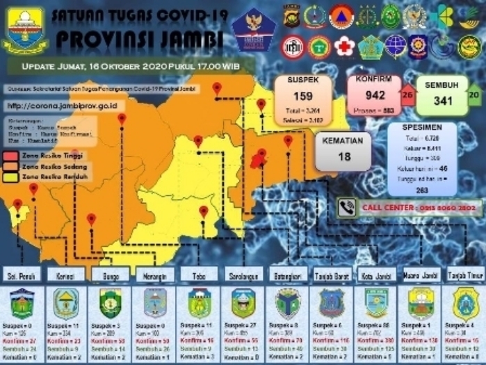 Jumlah pasien terkonfirmasi di Provinsi Jambi sebanyak 942 orang, dalam proses isolasi sebanyak 583 orang, sembuh 341 orang, jumlah pasien yang meninggal dunia 18 orang. Spesimen 532 orang dan suspek 159 orang.
