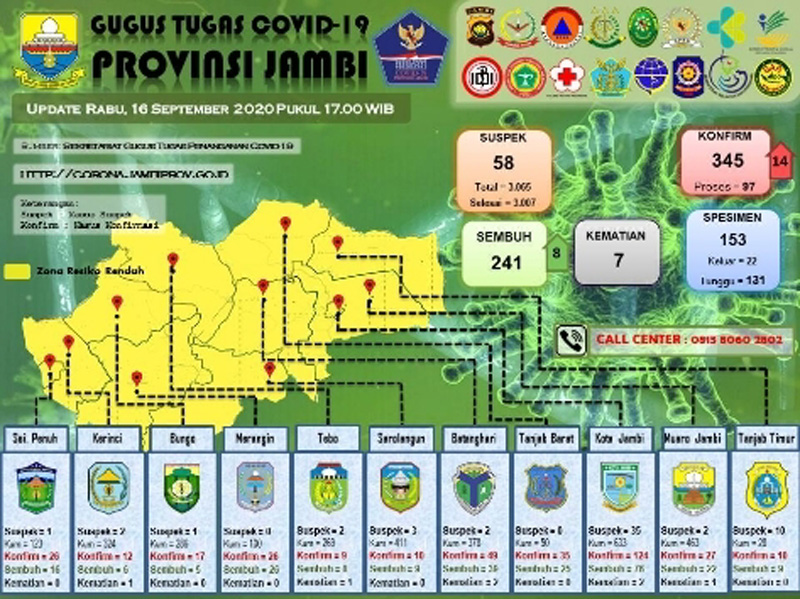 Secara keseluruhan warga Provinsi Jambi yang terkonfirmasi sebanyak 345 orang. Sedangkan pasien  yang dinyatakan sembuh 241 orang. Selanjutnya angka kematian 7 kasus, suspek 58 orang, spesimen 153 orang dan menunggu 131 orang. (mas)