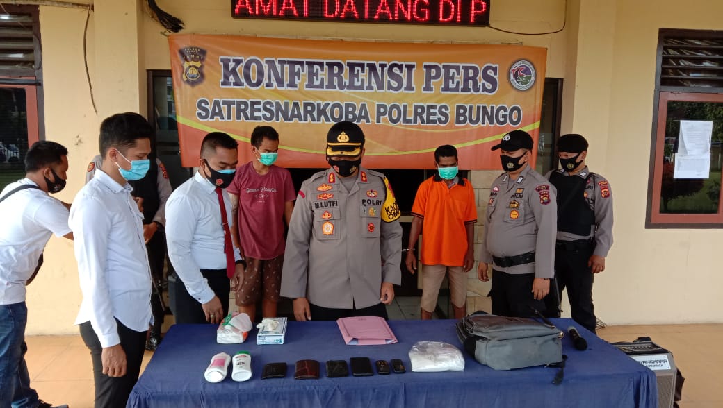 JAMBI-Polres Bungo kembali berhasil mengungkap tindak pidana Narkoba pengungkapan jaringan antar provinsi dan Internasional berjumlah empat orang terduga pelaku membawa Narkoba beberapa Minggu lalu. Selanjutnya polisi kembali mengamankan sabu kurang lebih empat ons dengan tiga pelaku berasal dari provinsi Aceh, Senin (16/11/2020).