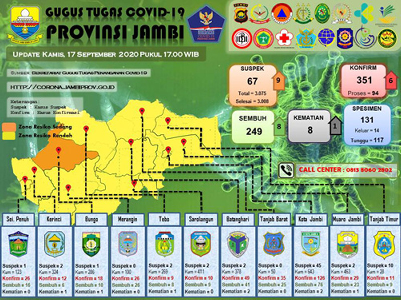 Sementara berdasarkan update data Gugus Tugas Provinsi Jambi, saat ini jumlah suspek sebanyak 67 orang, terkonfirmasi positif sebanyak 351 orang dan 249 diantaranya sembuh serta delapan orang meninggal dunia. (mas)
