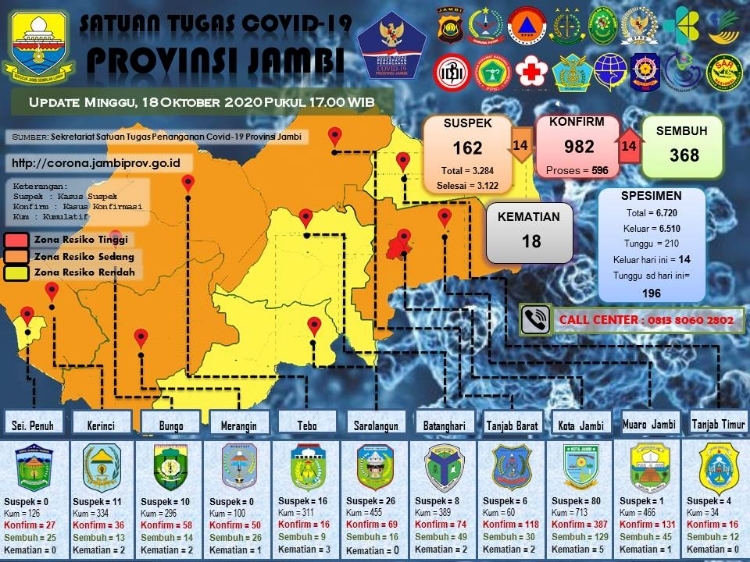 Jumlah pasien terkonfirmasi di Provinsi Jambi sebanyak 982 orang, dalam proses isolasi sebanyak 596 orang, sembuh 368 orang, jumlah pasien yang meninggal dunia 18 orang. Spesimen 196 orang dan suspek 162 orang.
