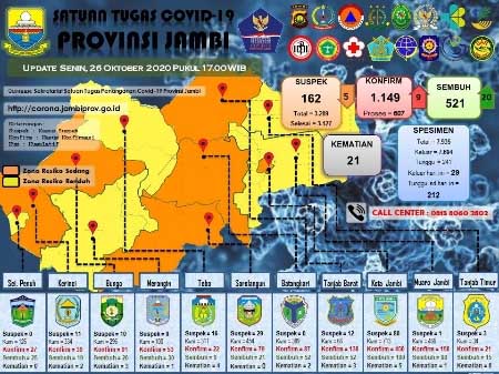 Hingga saat ini ada 5 wilayah zona kuning yaitu Merangin, Sungaipenuh, Tebo, Muarojambi dan Tanjab Timur. Kemudian 6 zona oranye yaitu Kota Jambi, Tanjab Barat, Kerinci, Bungo, dan Batanghari. (mas)