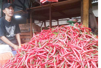 Menurutnya hari ini hanya dua komoditi yang mengalami kenaikan, sedangkan komoditi lain masih stabil dan tidak ada kenaikan. Memang diakuinya harga komoditi cabe hari ini naik secara signifikan, disebabkan musim penghujan di sentra cabe baik lokal maupun pulau Jawa.