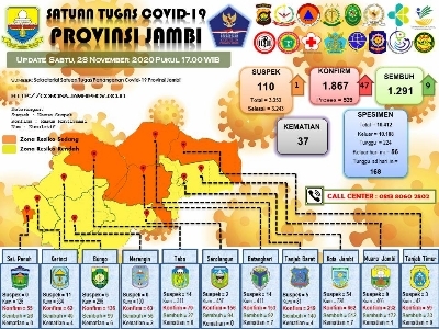 Mediajambi.com – Pasien terkonfirmasi Covid-19 di Provinsi Jambi dalam beberapa pekan ini terus bertambah. Berdasarkan data dari gugus tugas Covid -19 Sabtu (28/11/2020) terjadi penambahan sebanyak 47 orang.